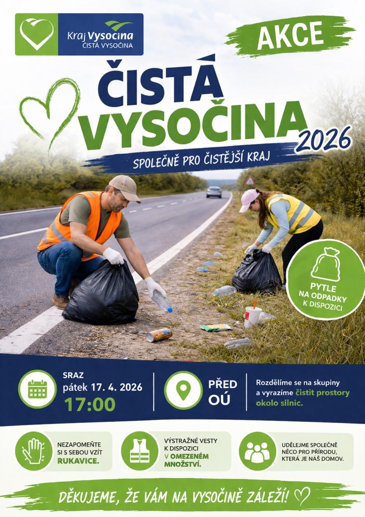 V pátek 17. 4. 2026 od 17:00. Sraz před obecním úřadem. Nezapomeňte si vzít ochranné rukavice a výstražnou vestu.